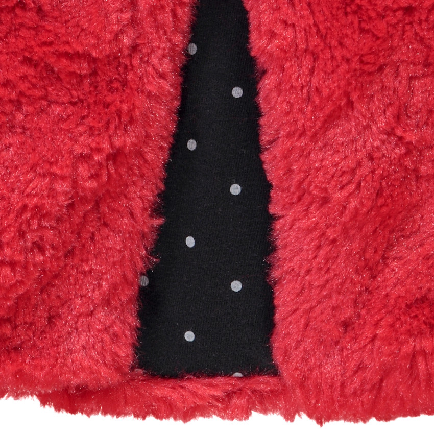 Gilet en fausse fourrure sans manches. Ouverture boutonnée sur le devant. Couleur unie. Intérieur contrasté avec imprimé pois.