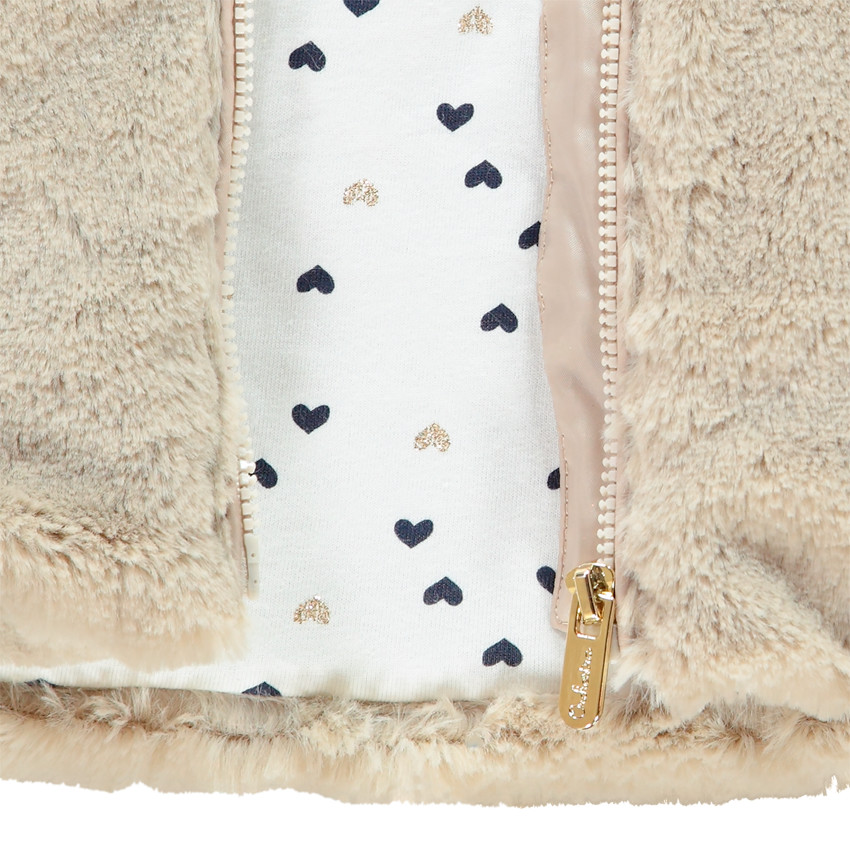 Manteau en fausse fourrure à capuche. Doublure imprimée coeurs en jersey. Oreilles en relief sur la capuche. Ouverture zippée sur le devant.