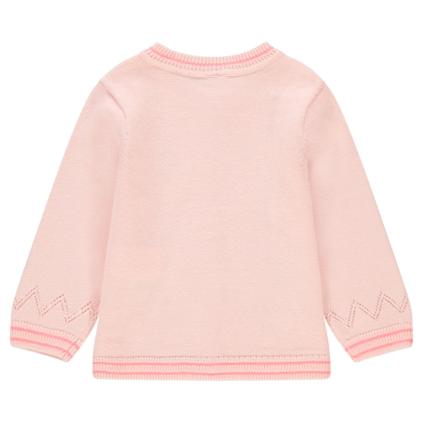 Gilet en tricot uni. Jours échelle placés devant et au bout des manches. Poignets et base en bord-côte rectiligne. Petits pompons cousus sur le devant.