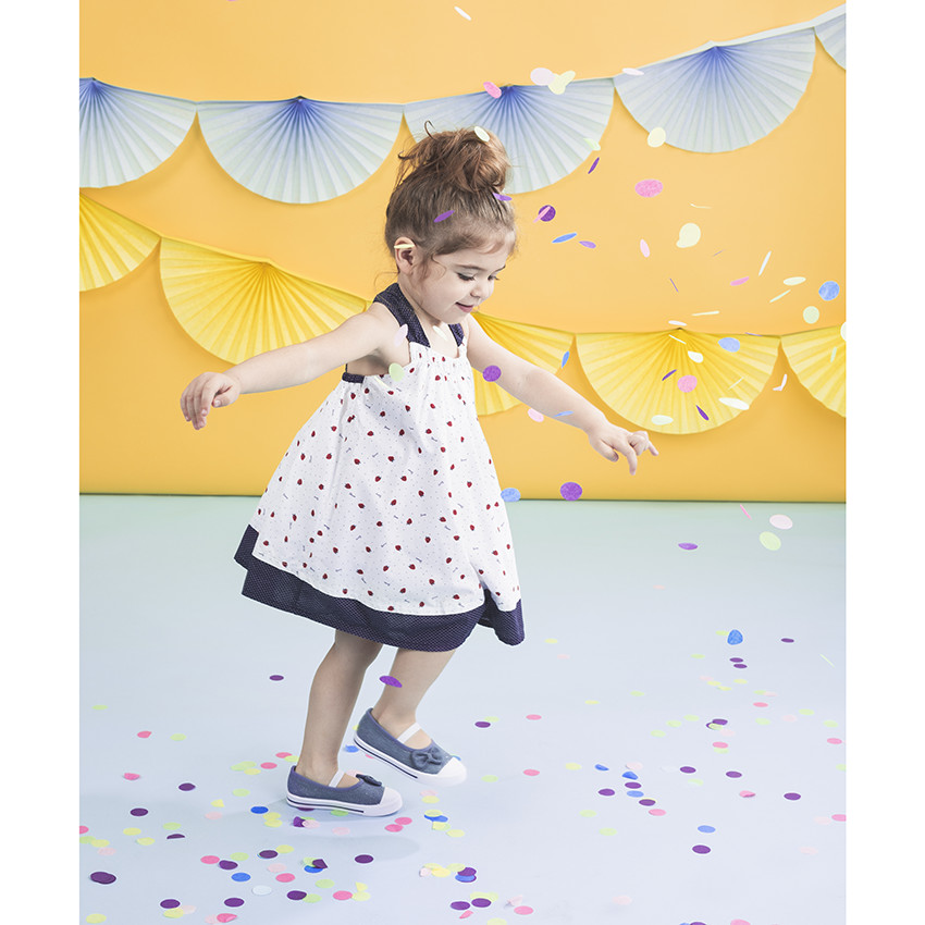 Robe à bretelles imprimées pois fins. Encolure élastiquée. Imprimé fraises all-over. Bas de la robe imprimé pois fins.