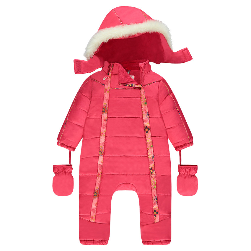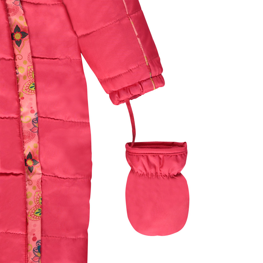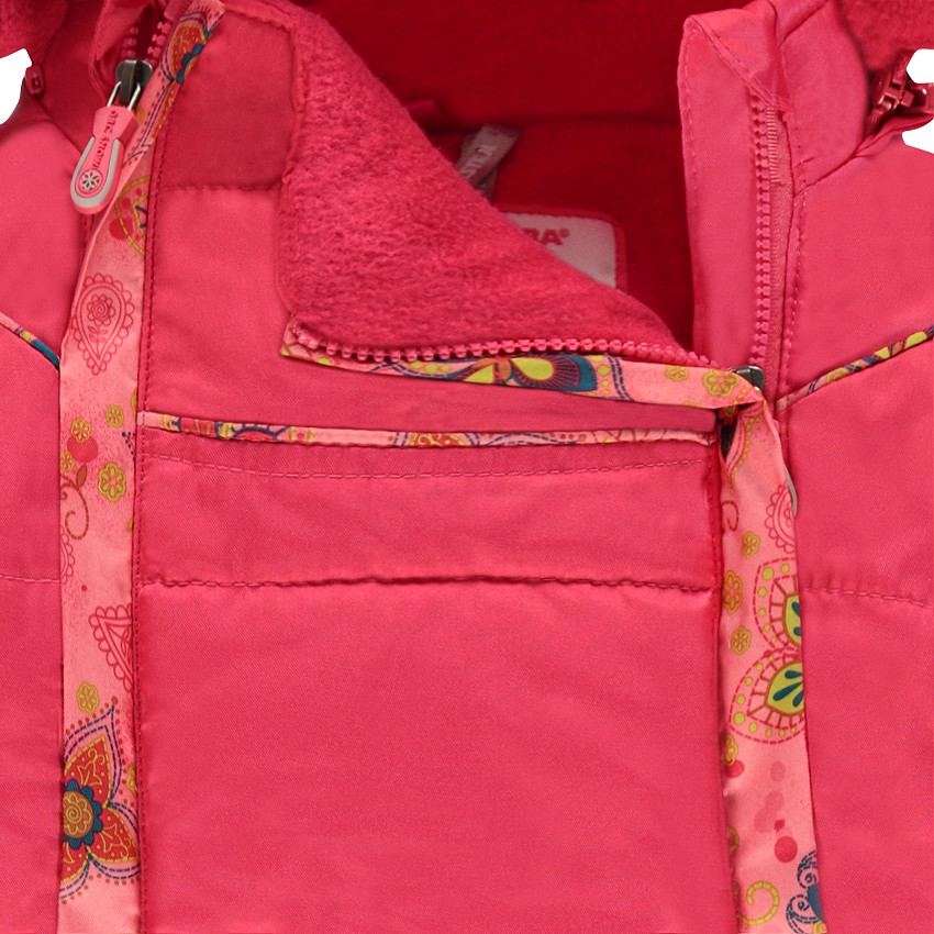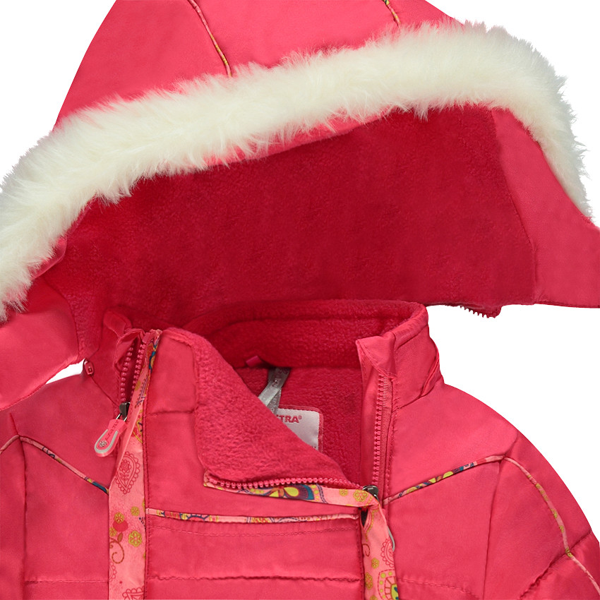 Combi-pilote de ski ouatinée. Coloris rose uni. Entièrement doublée en micropolaire. Capuche amovible par zip, avec bords en fausse fourrure. Empiècement protège menton avec fermeture par patte auto-agrippante. Col montant. Double ouverture zippée sur toute la longueur. Protection anti-pincement. Empiècements imprimés fleuris.
