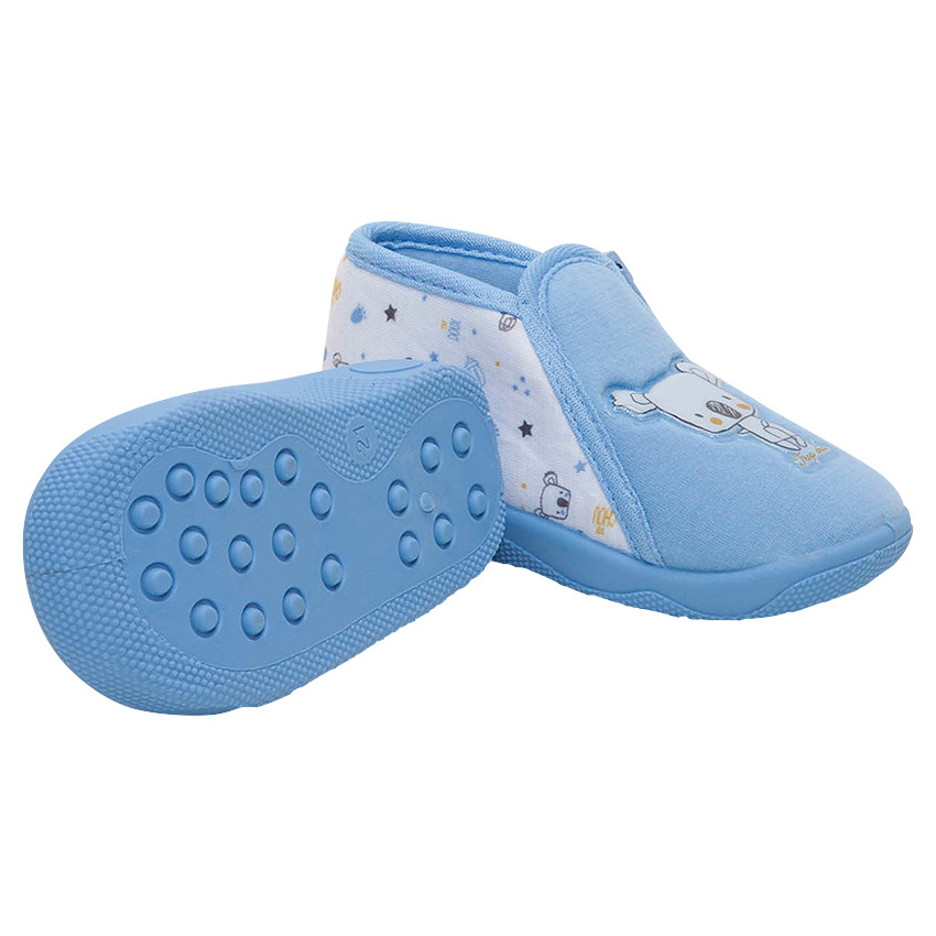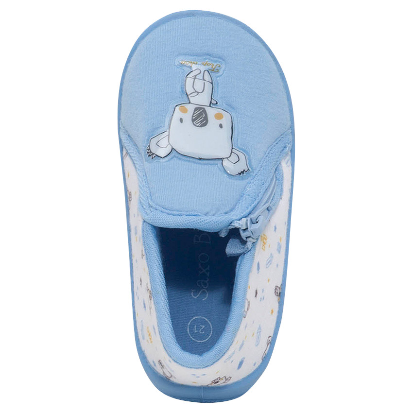 Chaussons forme bottillons. Ouverture zippée sur le cÎté. Patch plastifié sur le dessus. Dos du chausson imprimé. Semelle souple antidérapante.
