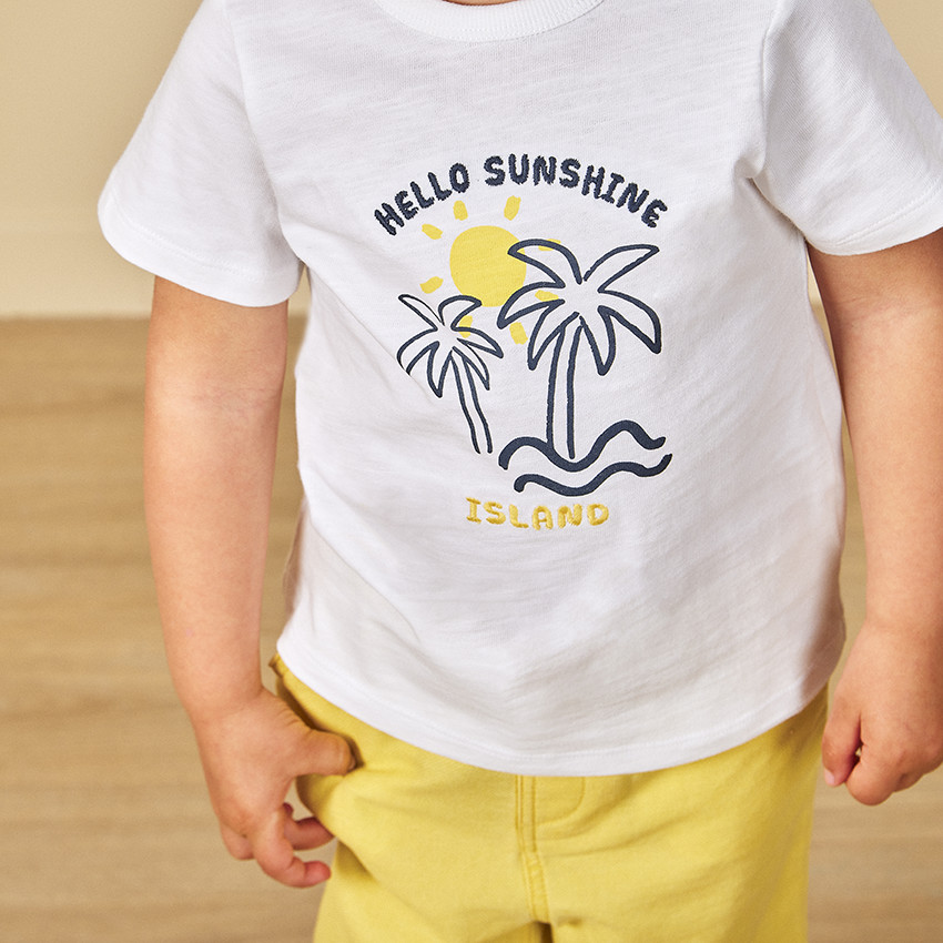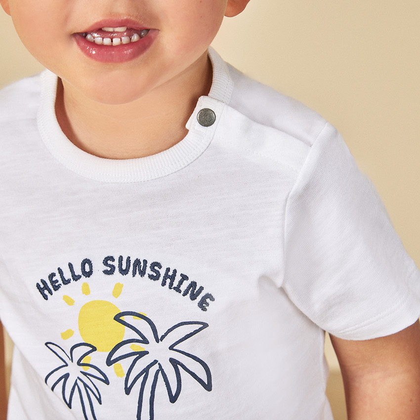 - T-shirt manches courtes en jersey. Coloris uni blanc. Encolure ronde en bord-côte. Ouverture pressionnée en liquette sur l'épaule. Print placé palmiers et inscription brodée sur le devant. Dos uni.