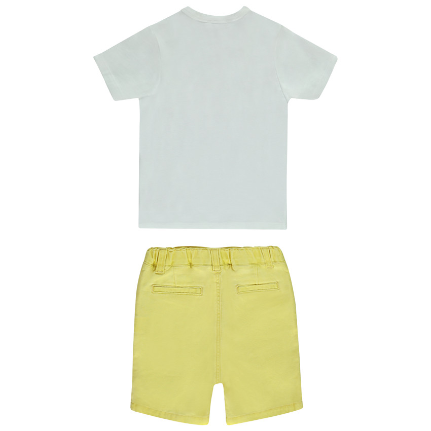- Bermuda en toile. Coloris uni jaune. Taille ajustable de l'intérieur (élastiques + boutons). Passants ceinture à l'extérieur. Ouverture pressionnée à l'avant. Braguette décorative. Deux poches italiennes sur le devant. Deux fausses poches raglan à l'arrière.
