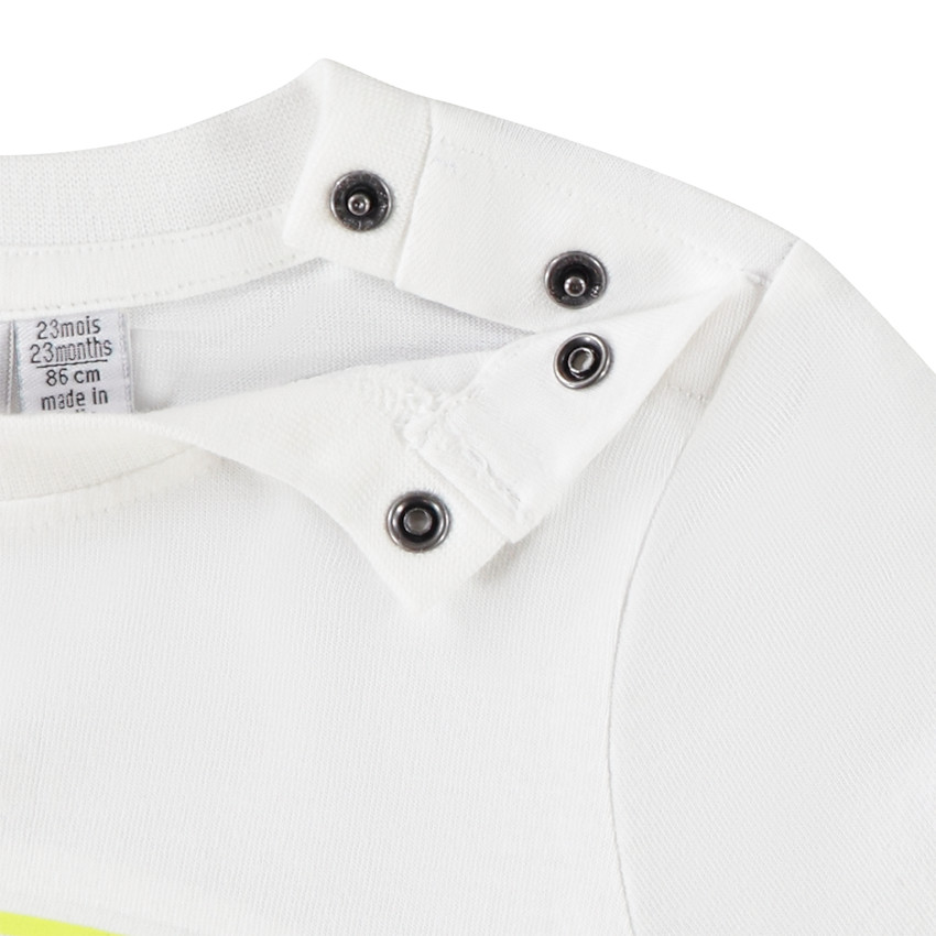 - T-shirt manches courtes. Coloris uni blanc. Encolure ronde. Ouverture pressionnée en liquette sur l'épaule. Broderie Batman contrastée sur chaque manche. Print embossed Batman sur le devant. Dos uni.