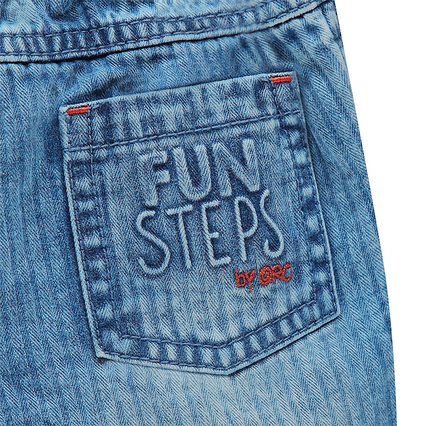 Jeans effet used en denim léger effet rayé. Taille élastiquée à passants avec cordons de serrage. Badge patché sur la jambe droite. 1 poche plaquée au dos avec inscription en relief.