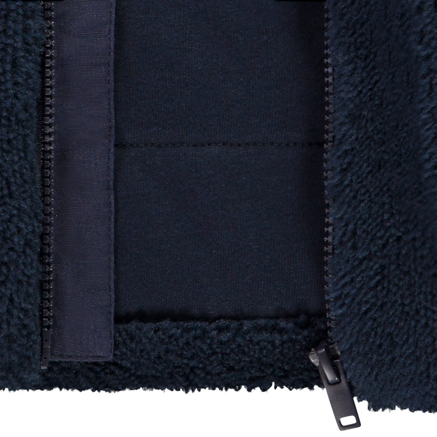 Gilet sans manches en sherpa et polaire effet moutonné. Doublure en jersey. Coloris uni bleu marine. Col montant bleu mat. Protège-menton. Ouverture zippée ton sur ton à l'avant. Deux poches plaquées italiennes sur le devant avec liseré bleu mat. Dos uni.