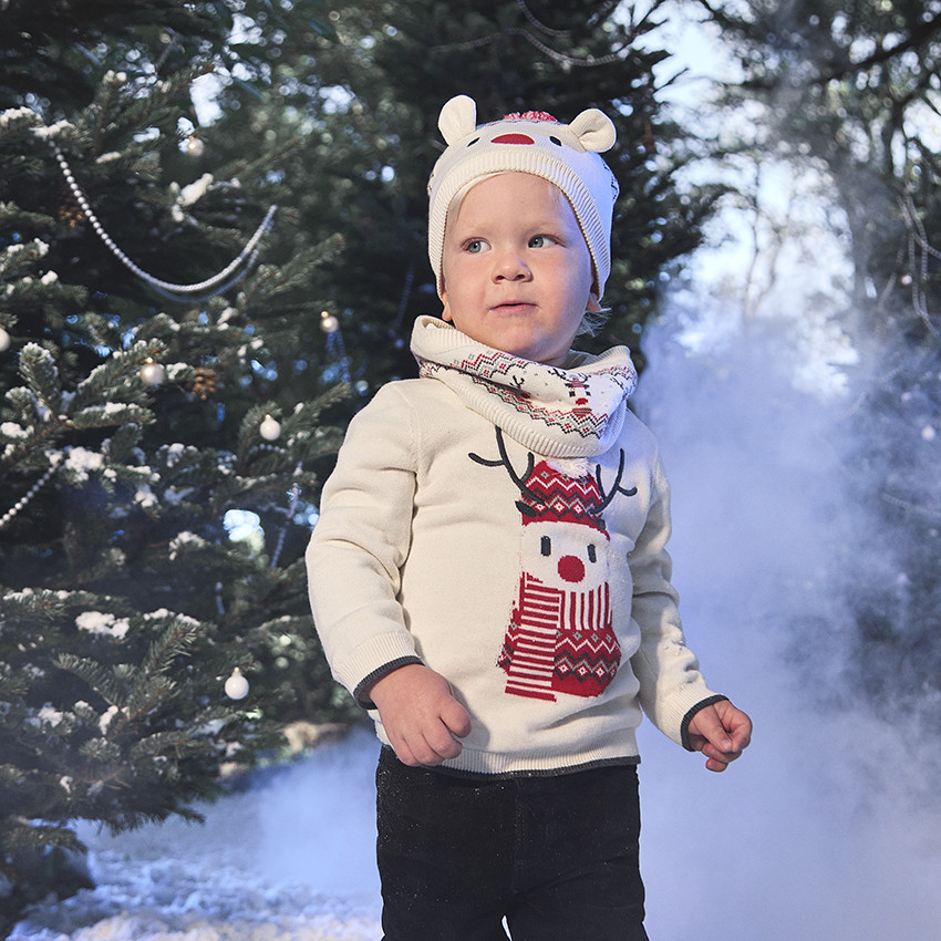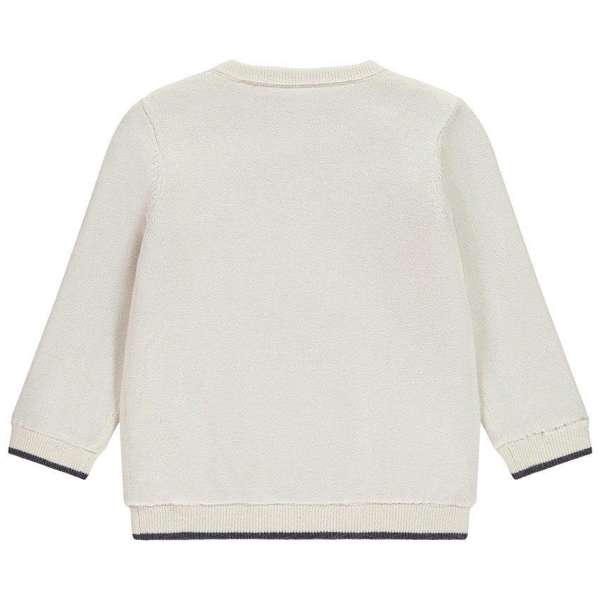 Pull à manches longues en tricot. Doublure corps en velours. Coloris écru. Renne brodée en jacquard avec pompon en relief sur le devant. Encolure ronde en bord-côtes. Ouvertures boutonnées sur l'épaule. Poignets et base en bord-côtes avec liseré contrasté. Dos uni.