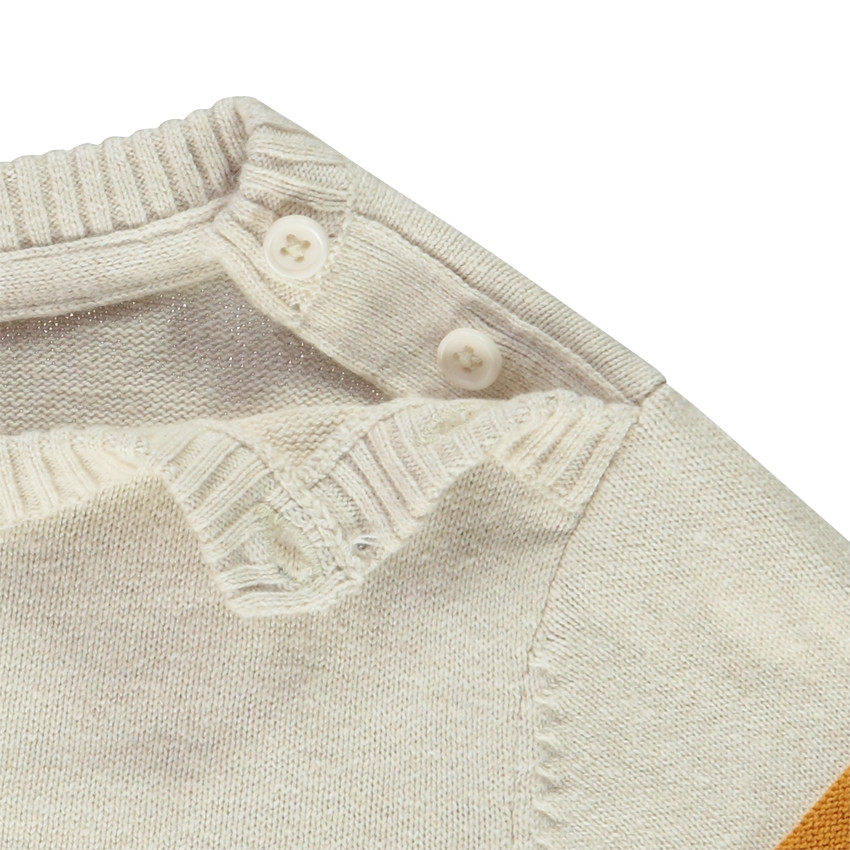 Pull en tricot. Encolure ronde en bord côte avec ouverture boutonnée sur l'épaule. Manches longues avec poignets et base en maille extensible. Rayures contrastées en velours sur le buste et les manches.