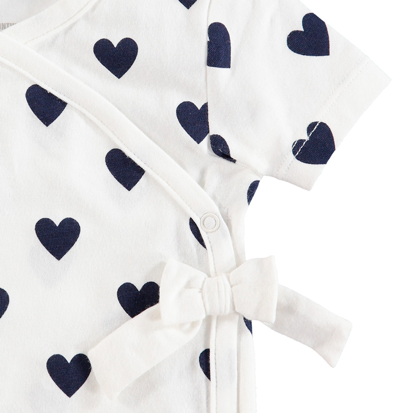 Body manches courtes à coeurs printés. Ouverture pressionnée sur le côté avec liens à nouer. Ouverture pressionnée à l'entrejambe.