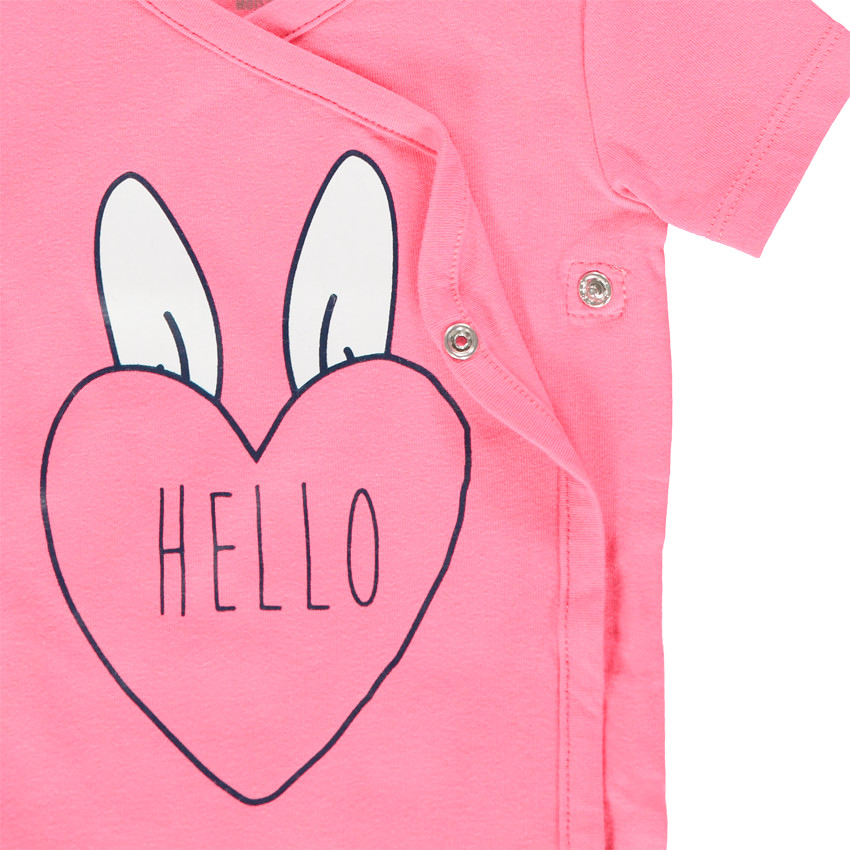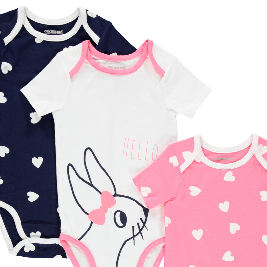 Lot de 5 bodies manches courtes. Ouverture pressionnée croisée devant du 1 au 6 mois. Emmanchures US du 9 au 36 mois. Entrejambe pressionné.