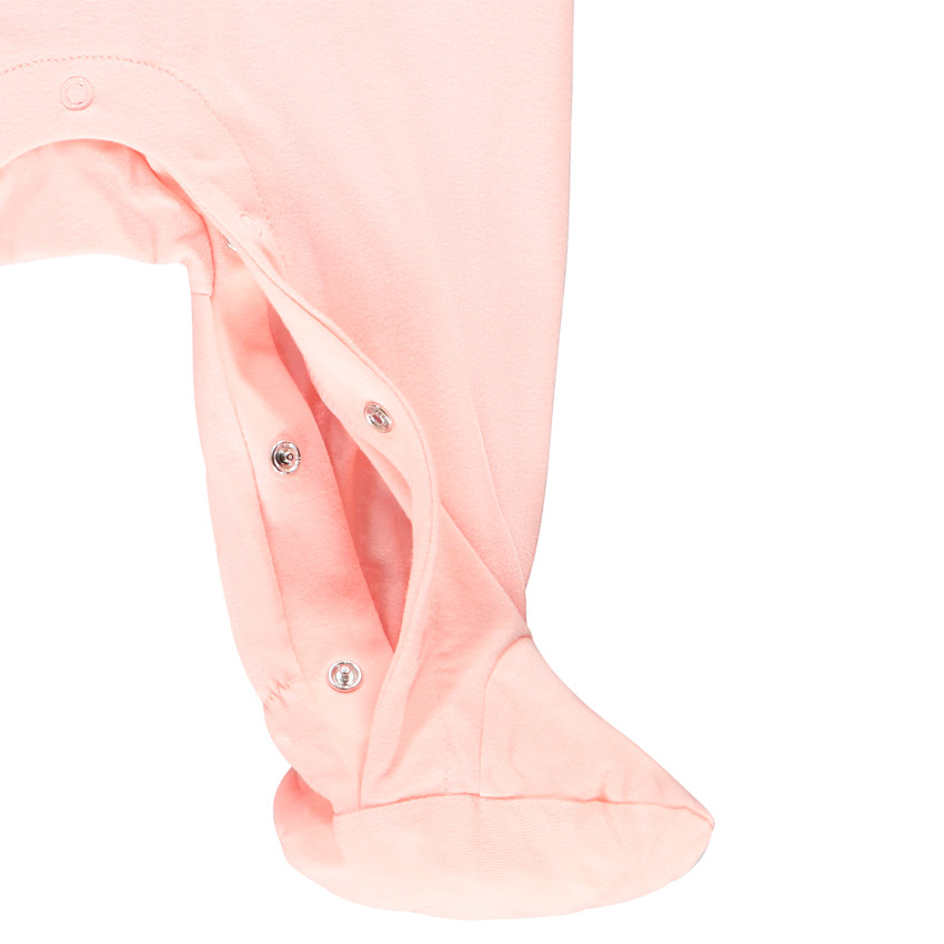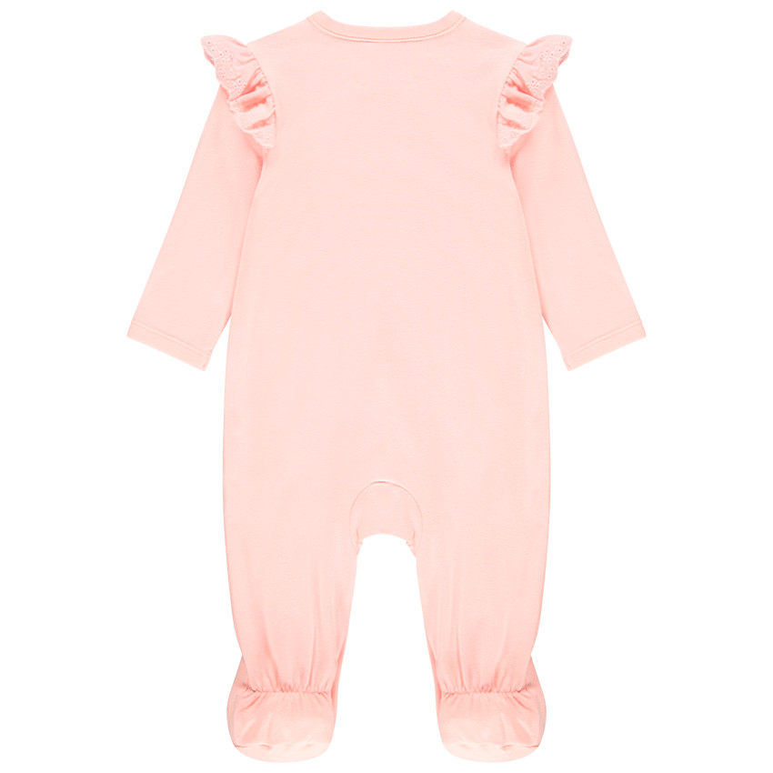 Dors-bien rose. Coton issue de l'agriculture biologique pour préserver la peau et l'environnement. Ouverture pressionnée devant et à l'entrejambe. Volants en broderie anglaise sur les emmanchures. Lapins printés sur le devant.