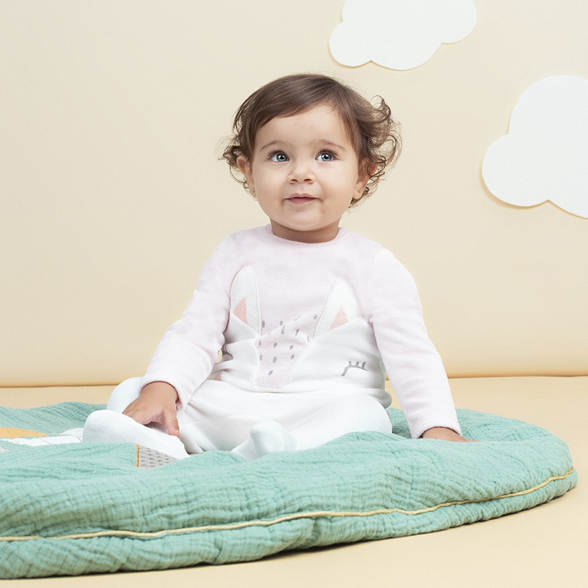 Dors-bien en velours motif lapin. Encolure ronde. Motif lapin à oreilles brodées sur le devant. Ouverture pressionnée dos et pont.