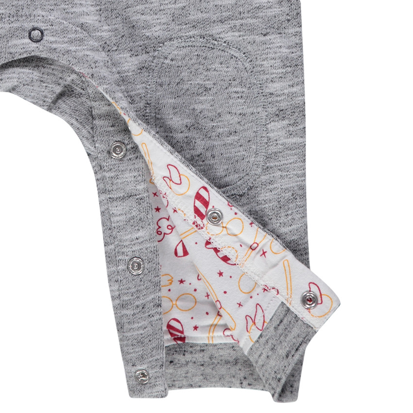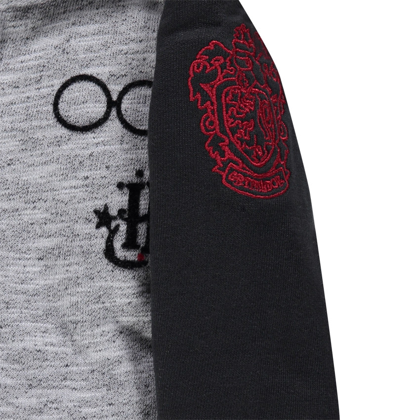 Combinaison à capuche en molleton aspect neps. Doublure intérieure en jersey imprimé. Manches contrastées avec revers imprimés. Ouverture boutonnée au col. Logo Gryffondor brodé sur la manche gauche. Symboles en feutrine printés sur la poitrine. Patchs ton sur ton sur les genoux. Entrejambe pressionné. Inscription printée au dos.