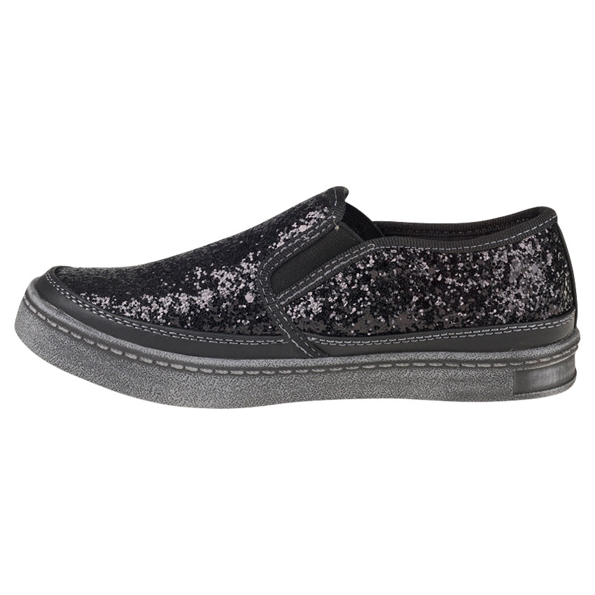 Baskets basses à paillettes. Coloris noir uni. Empiècement élastiqué sur les côtés pour les enfiler facilement. Semelle extérieure en caoutchouc.