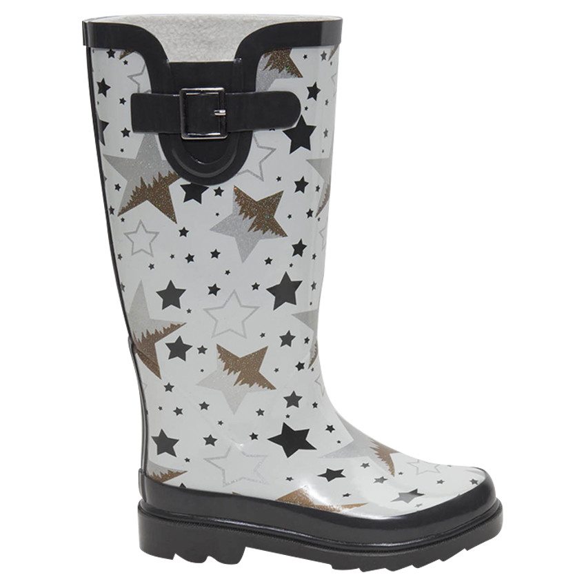 Bottes de pluie en caoutchouc. Imprimé étoiles all-over. Boucle fantaisie sur le côté droit. Semelle à crampons.