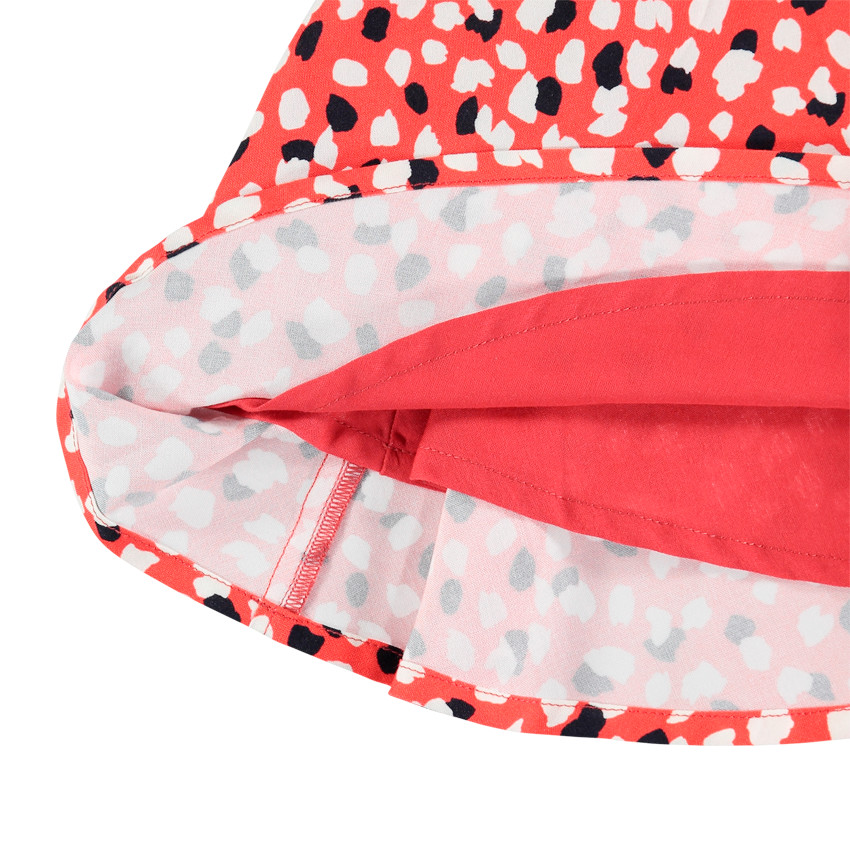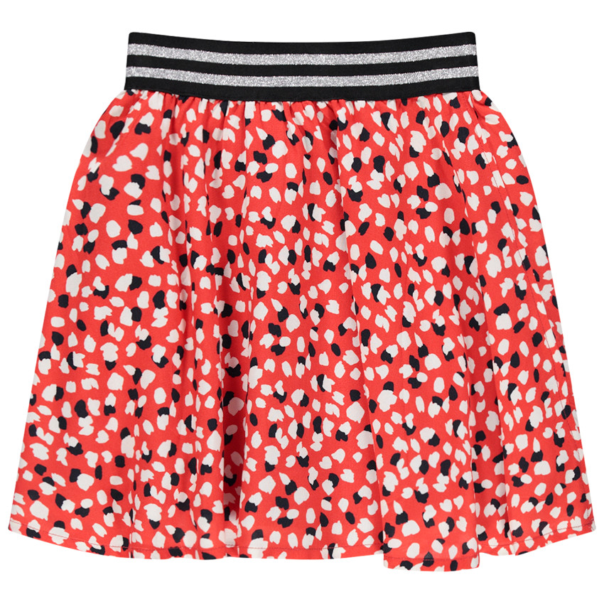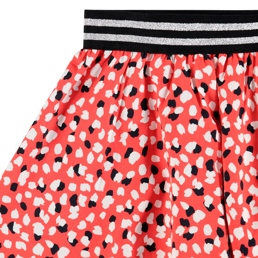 Jupe fluide évasée imprimée all-over. Tissu dessiné et imprimé en France. Taille élastiquée à rayures argentées. Doublure intégrée.