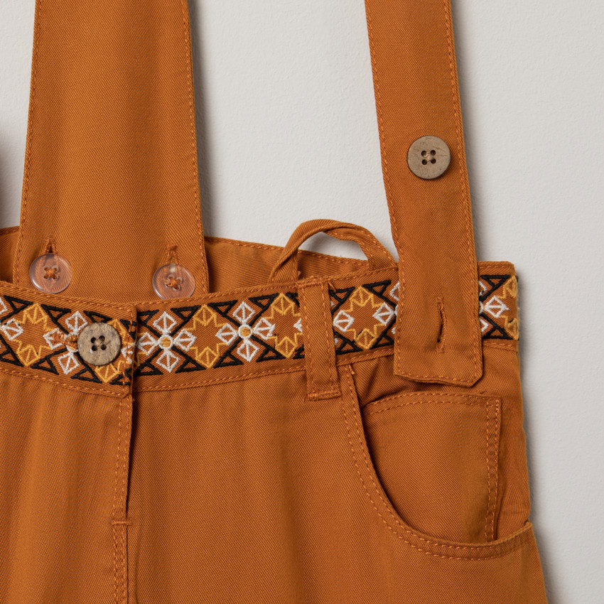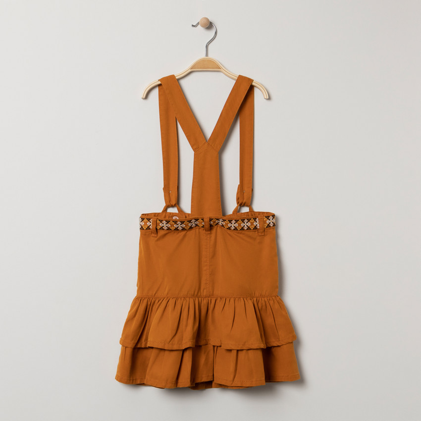 Jupe à bretelles ajustables en lyocell. Taille avec frise brodée colorée et passants. 2 poches cavalières devant. Volants superposés.