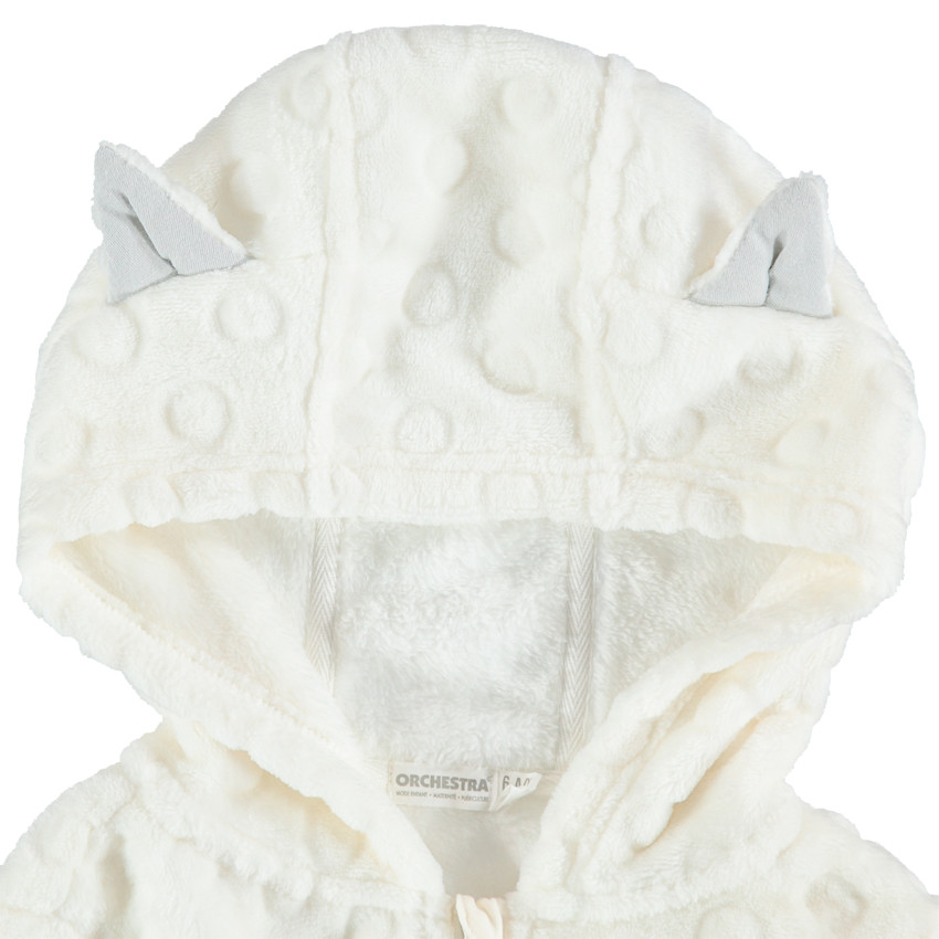 Gilet à capuche en sherpa reliéfée. Oreilles sur la capuche. Ouverture zippée devant. Poignets et base en bord-côte.