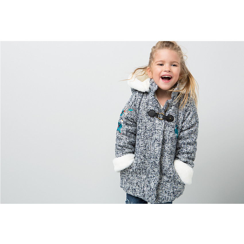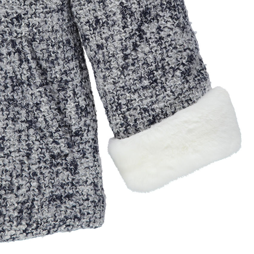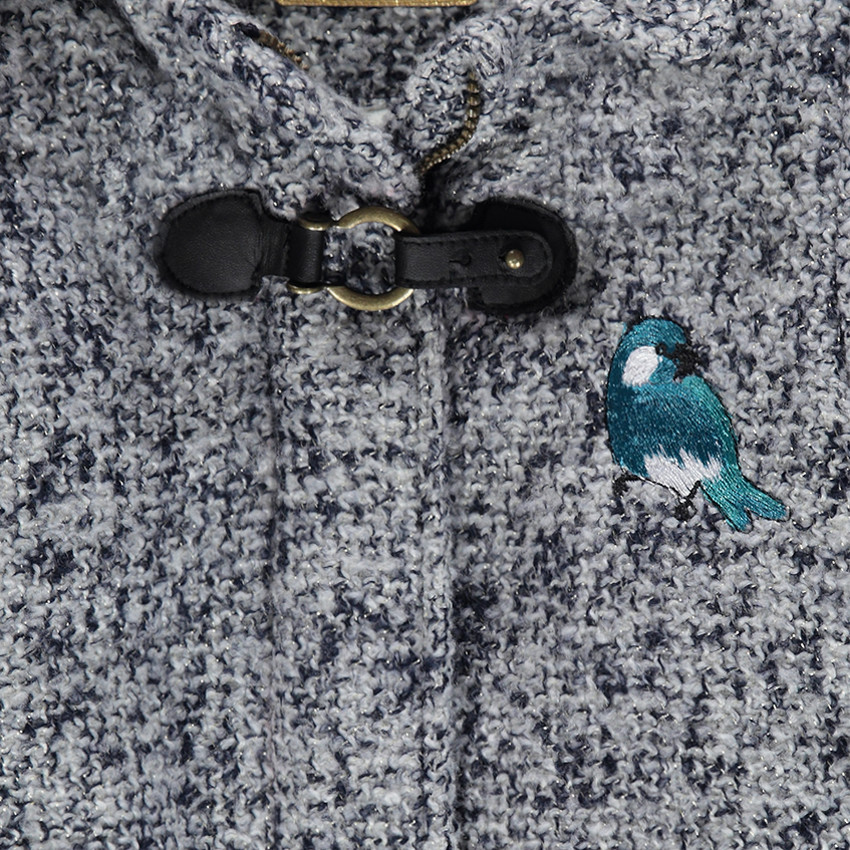 Manteau effet drap de laine tweedé avec fil métallique. Doublure en sherpa contrastée. Capuche amovible par zip, avec bords en fausse fourrure. Col montant. Ouverture par zip sur toute la longueur. Patte de retenue avec fermeture brandebourg en simili cuir sur le haut. Oiseau contrasté brodé sur la poitrine. 2 poches coupées sur les côtés. Revers aux manches en fausse fourrure. Étiquette intérieure pour marquer le nom de l'enfant.
