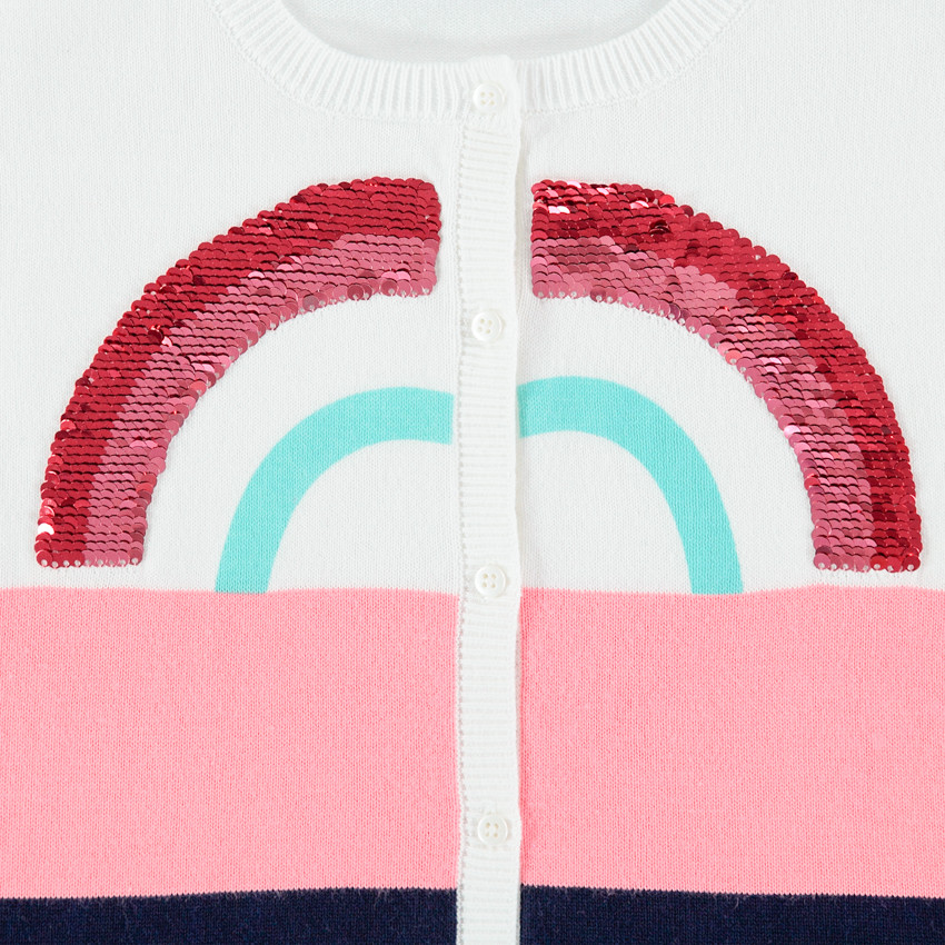 Gilet en tricot contrasté. Encolure ronde en bord-côte. Ouverture boutonnée devant. Arc-en-ciel en sequins sur le devant. Poignets et base en bord-côte.