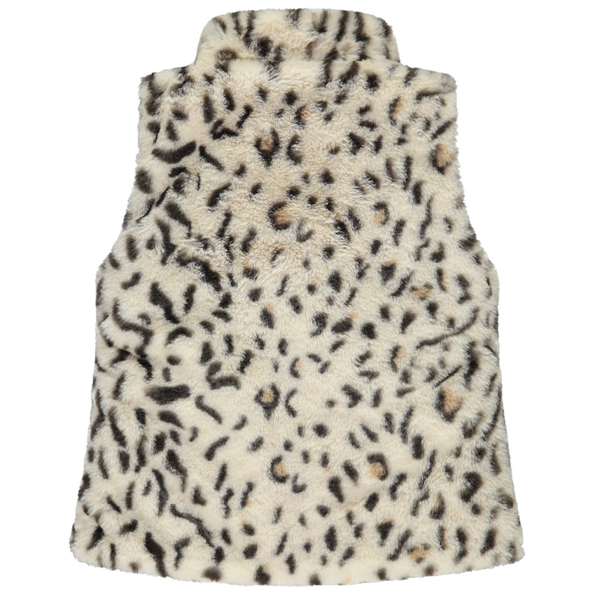 Gilet sans manches en sherpa effet fausse fourrure et intérieur en satin. Coloris écru. Imprimé léopard all-over. Col montant et ouverture zippée sur le devant.