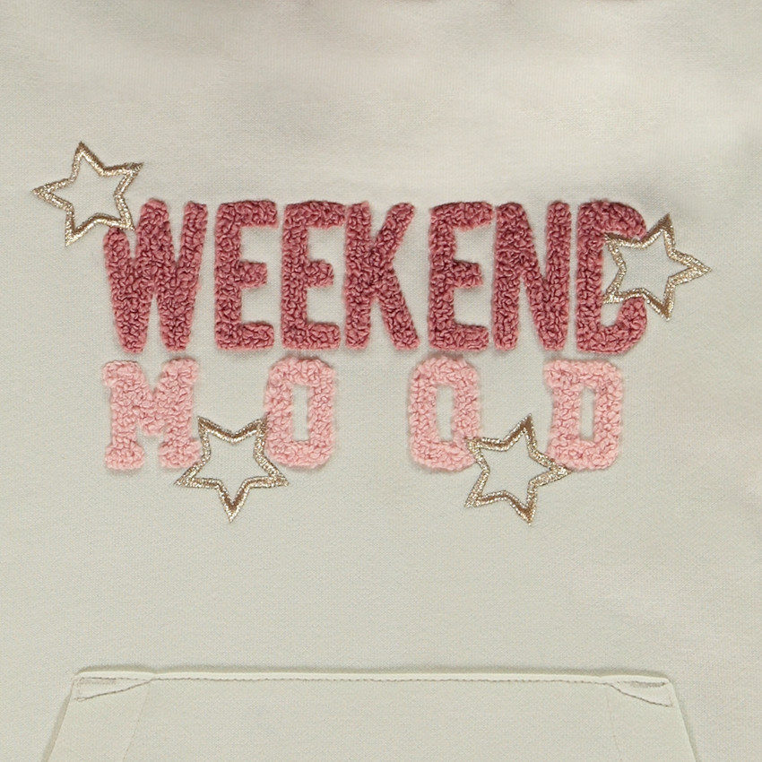 Sweat en molleton gratté. Effet color block : coloris écru/ bleu/rose. Capuche croisée. Manches longues bouffantes dépareillées. Poignets et base en bord-côte extensible. Inscription "Week-end mood" en bouclettes 3D et étoiles brodées en lurex doré sur le devant. Poche kangourou en-dessous. Dos uni.