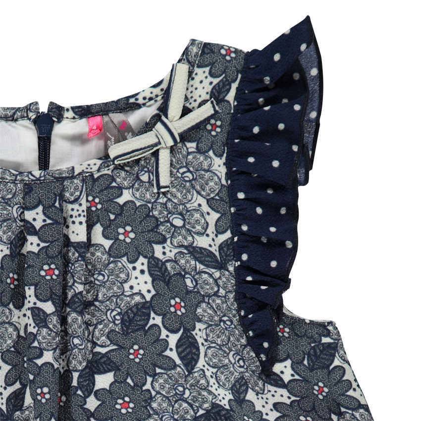 Robe sans manches en crêpe. Coloris écru et bleu marine. Imprimé fleuri. Encolure ronde avec plis rond devant. Ouverture par zip invisible au dos. Volant bleu marine à pois, cousu aux emmanchures. Bas de la robe rayé. Doublure en voile de coton.