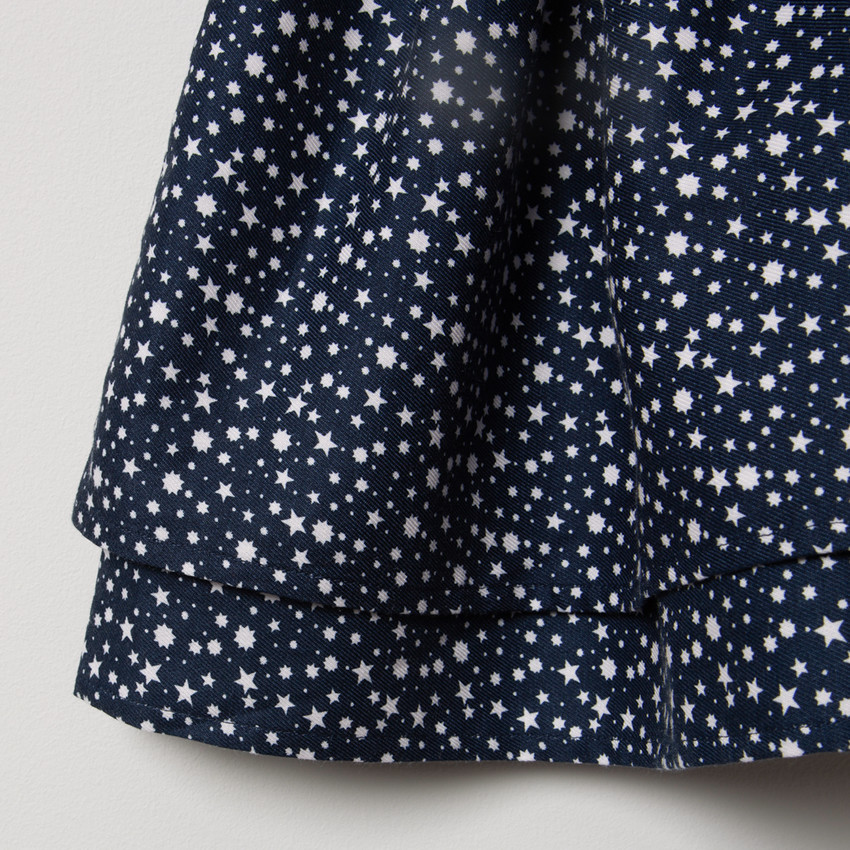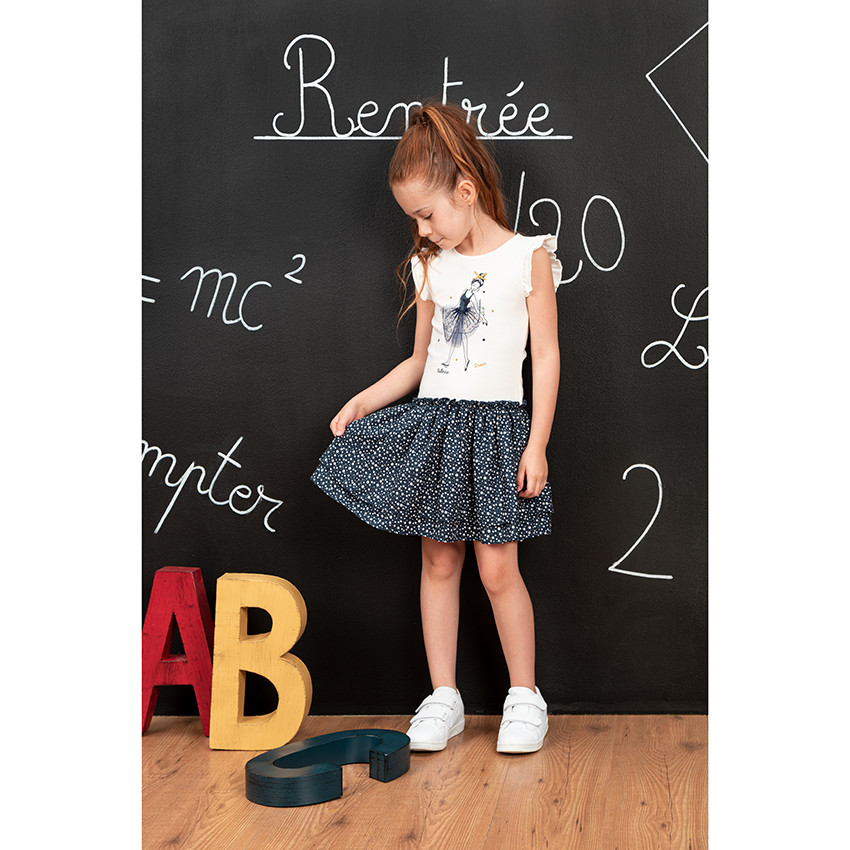 Robe manches courtes volantées. Encolure ronde en bord-cÎte. Danseuse printée devant avec tulle. Découpe à la taille. Bas de la robe volanté imprimé all-over.
