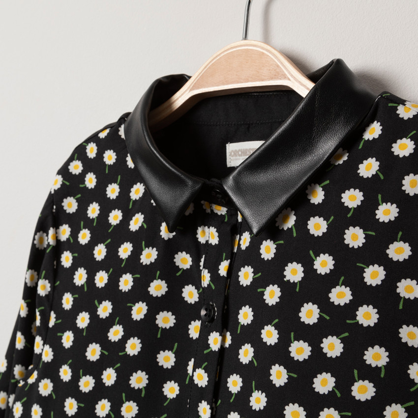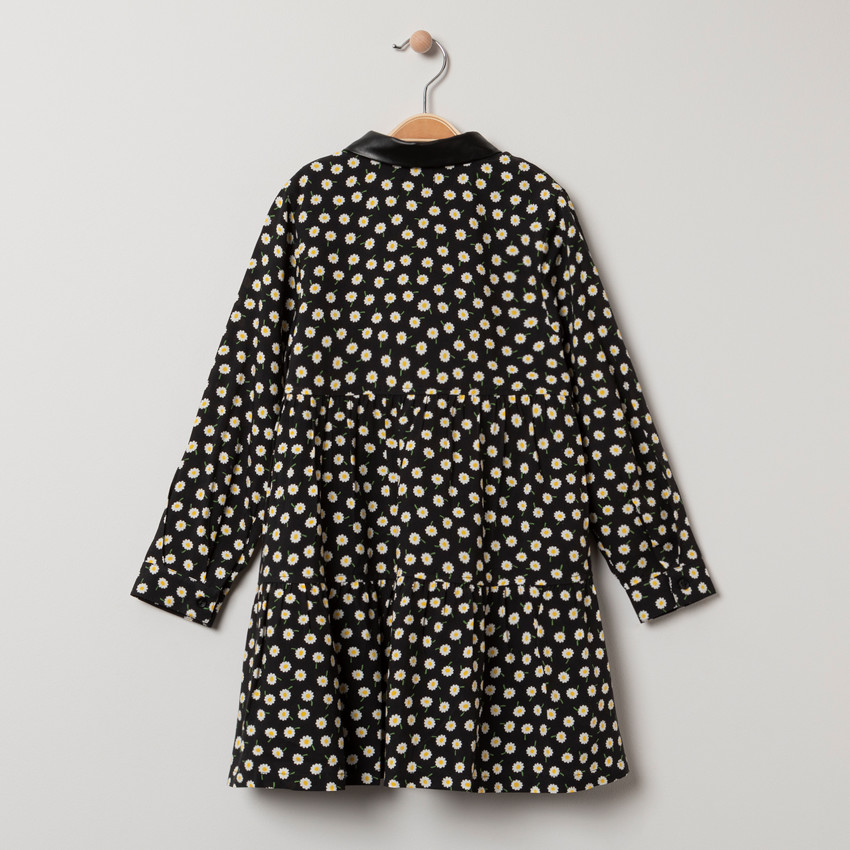 Robe manches longues imprimée fleurs all-over. Col en simili cuir. Ouverture boutonnée devant. Doublure intégrée. Coupe ample.