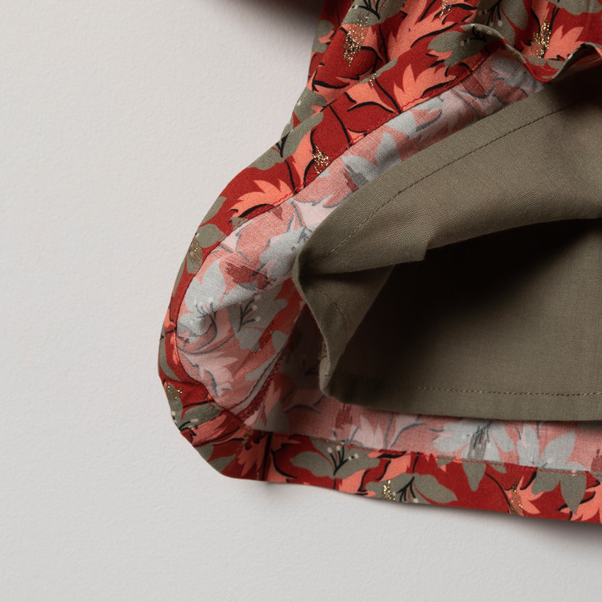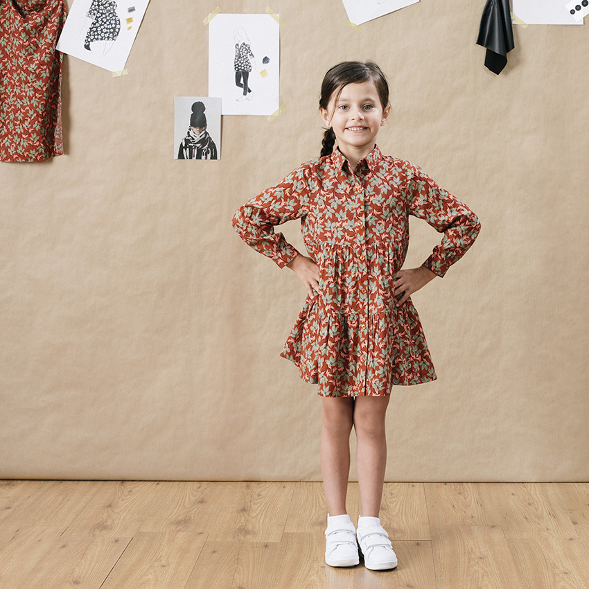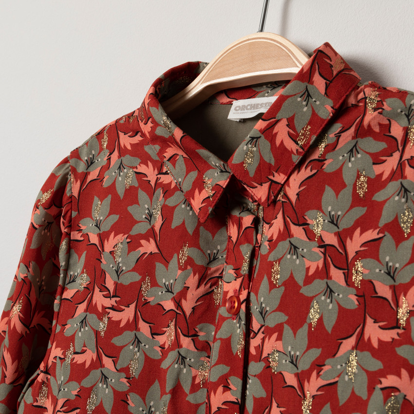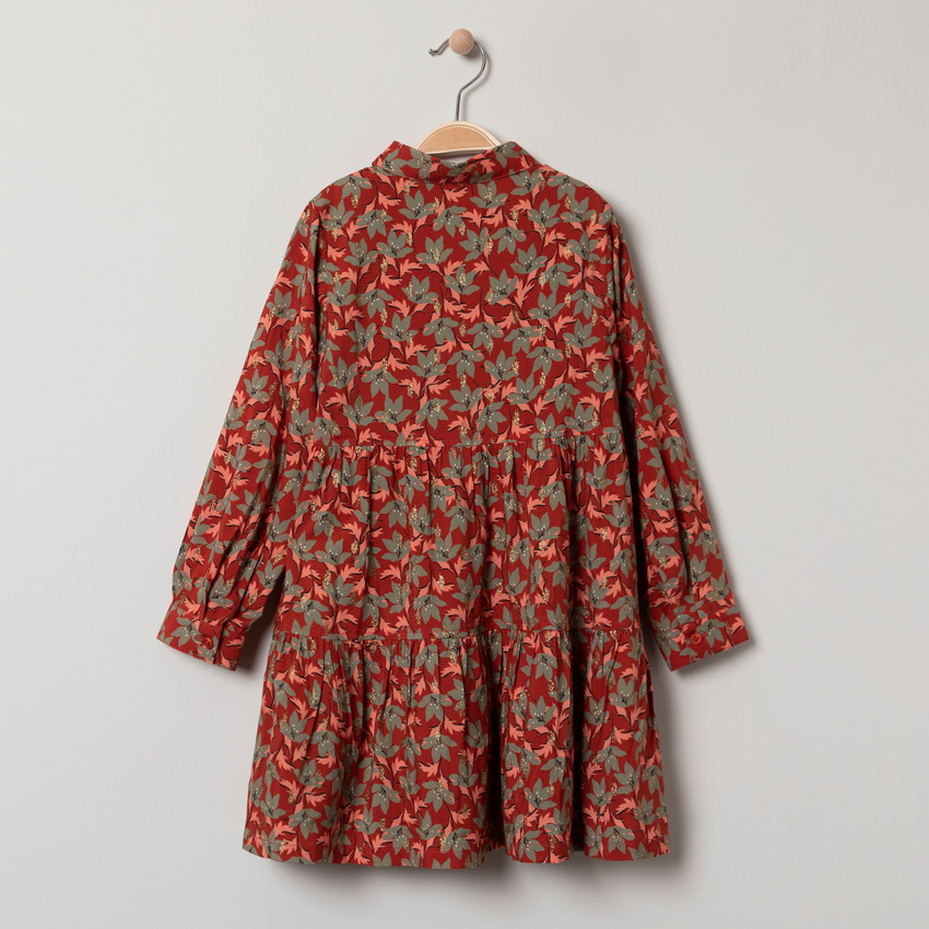Robe manches longues imprimée feuilles all-over. Ouverture boutonnée devant. Col chemise. Touches de doré. Doublure intégrée. Découpes volantées.