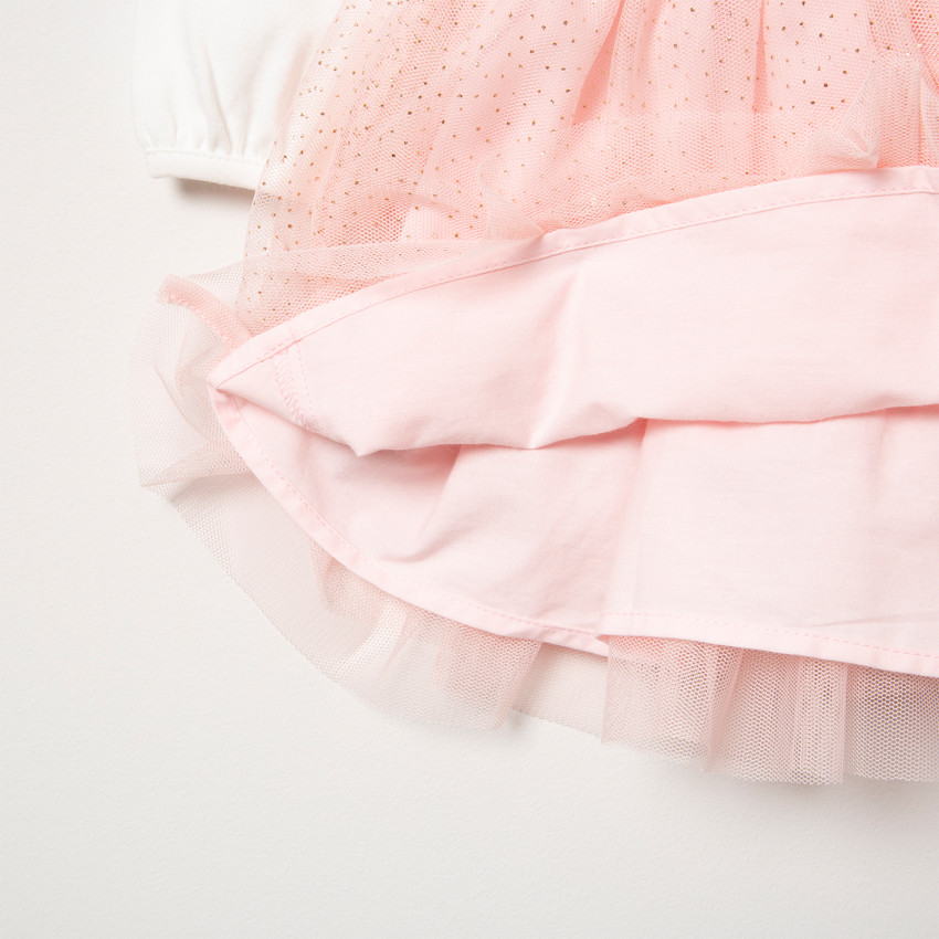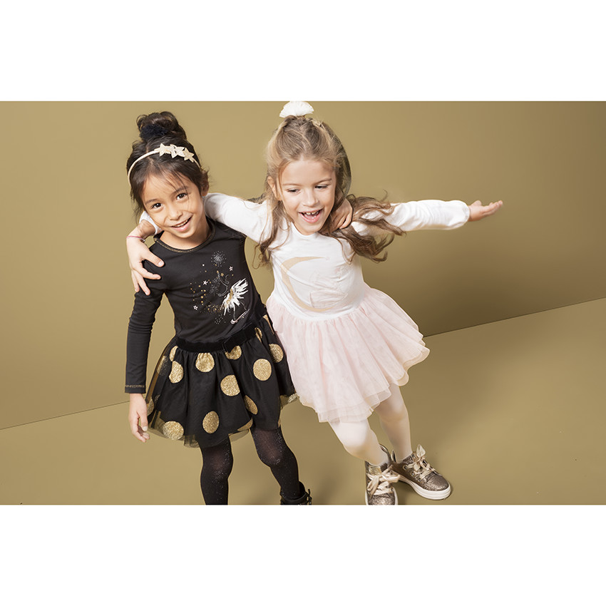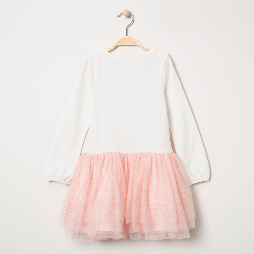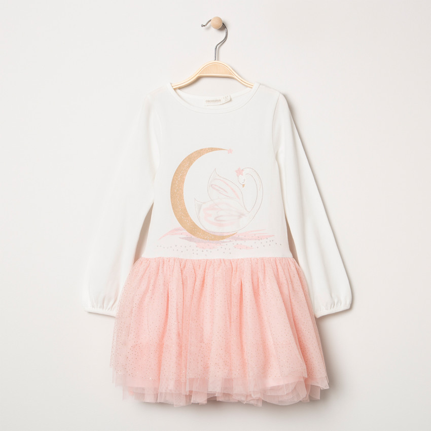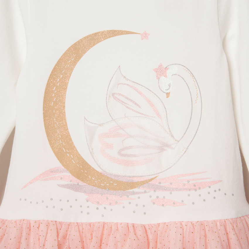 Robe manches longues effet 2 en 1 bi-matière. Encolure ronde en bord-côte. Cygne printé sur le devant avec paillettes dorées. Tulle sur le bas de la robe à pois fins et doublure intégrée.