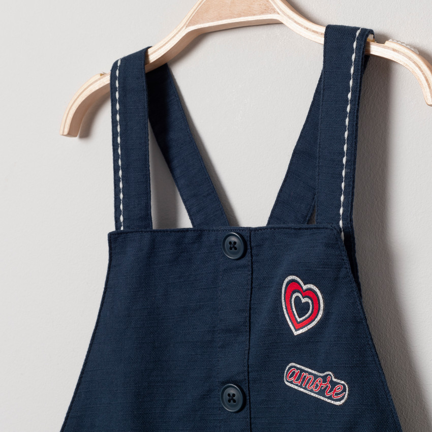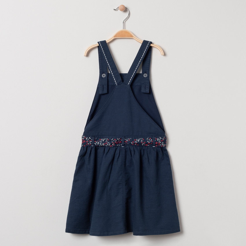 Robe salopette Ă bretelles. Patches fantaisies sur le devant. Fausse boutonniĂšre sur le devant. Bandeau fleurie style ceinture Ă la taille. 2 poches sur le devant