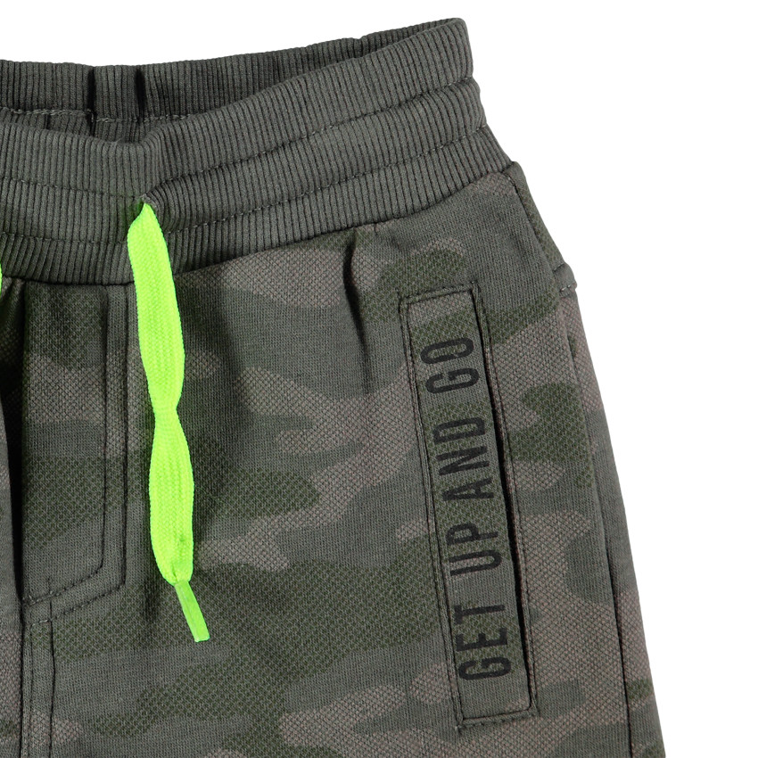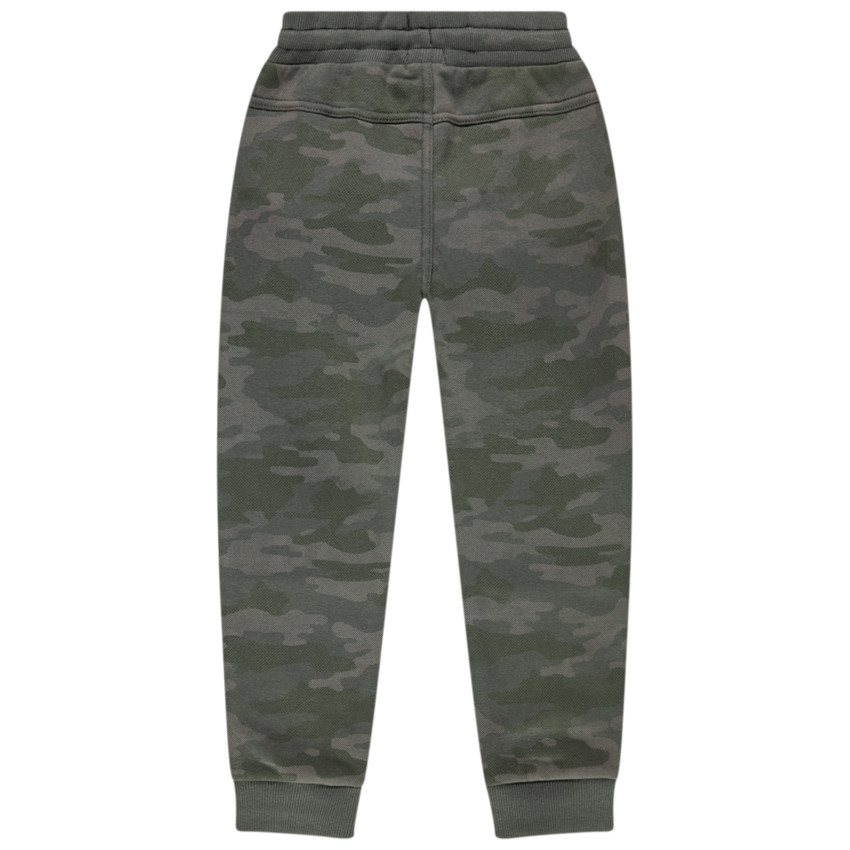 Pantalon de jogging en molleton imprimé camouflage all-over. Taille élastiquée à cordons de serrage fluos. 2 poches passepoilées devant avec inscription sur celle de droite. Découpes sur les jambes et jeux de surpiqûres. Chevilles élastiquées en bord-côte.