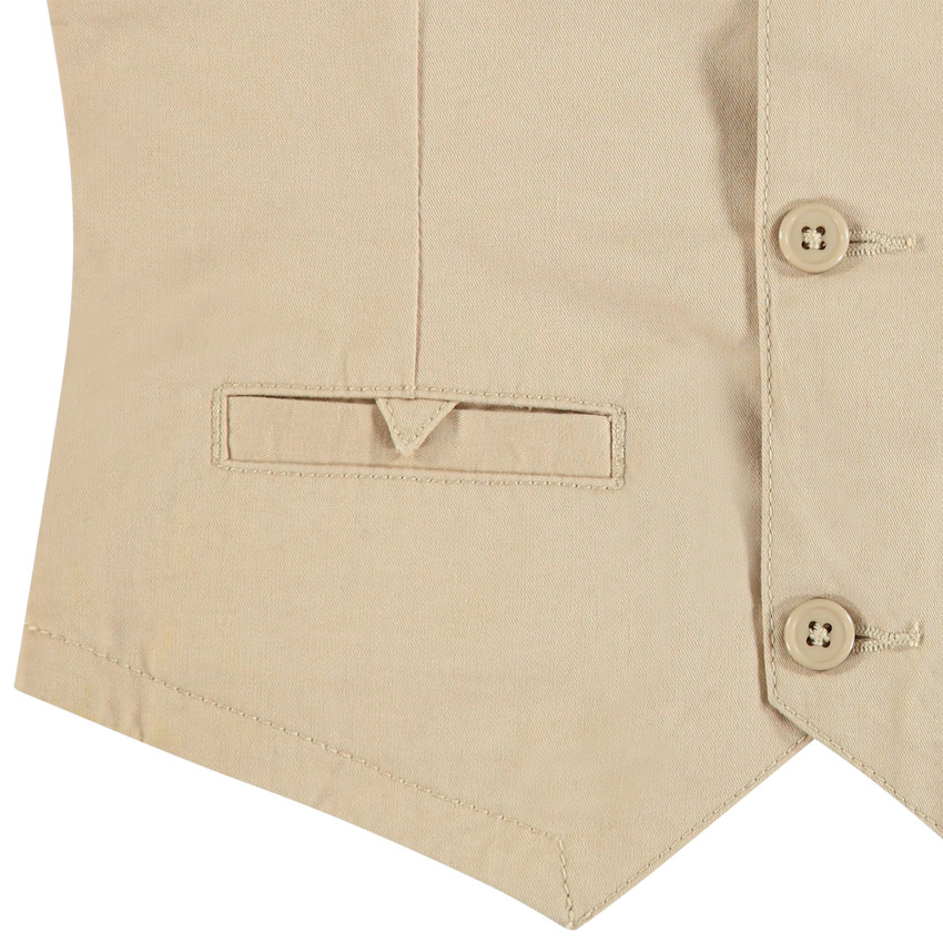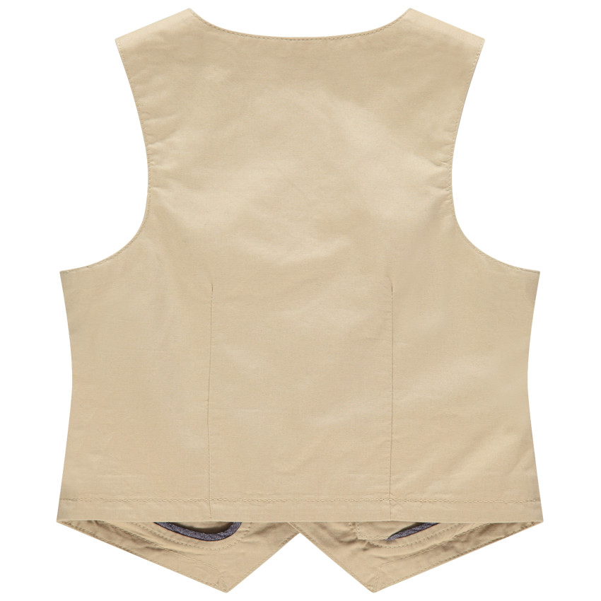 Gilet serveur en toile. Doublure en chambray. Ouverture boutonnée devant. 2 poches passepoilées devant.