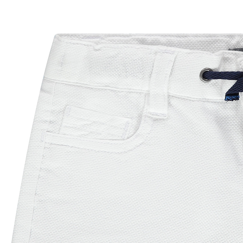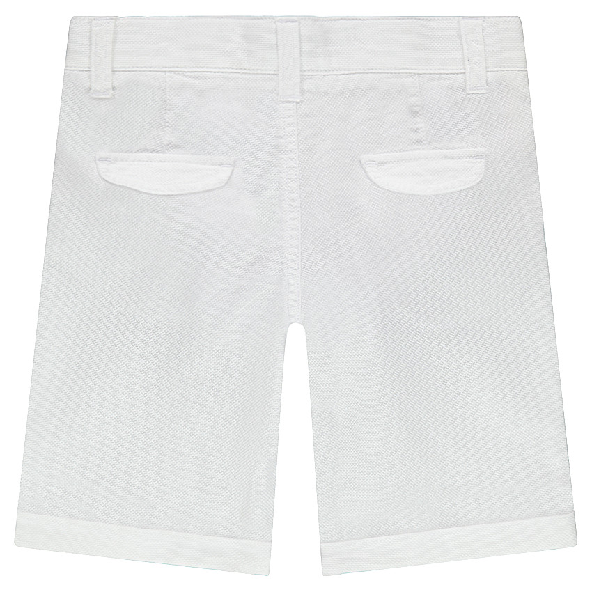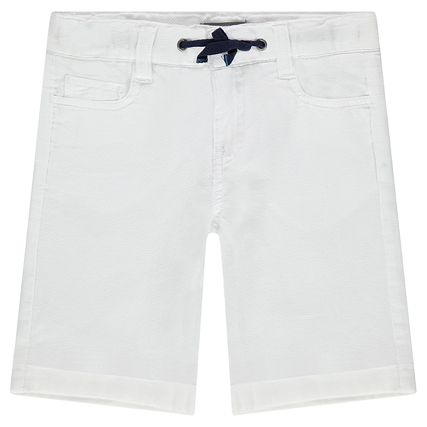 Bermuda en coton fantaisie. Taille ajustable de l'intérieur par élastique et boutons. Ceinture à passants avec cordons de serrage. 2 poches cavaliÚres devant et 1 poche ticket. Revers fixes. 2 poches à rabat au dos.