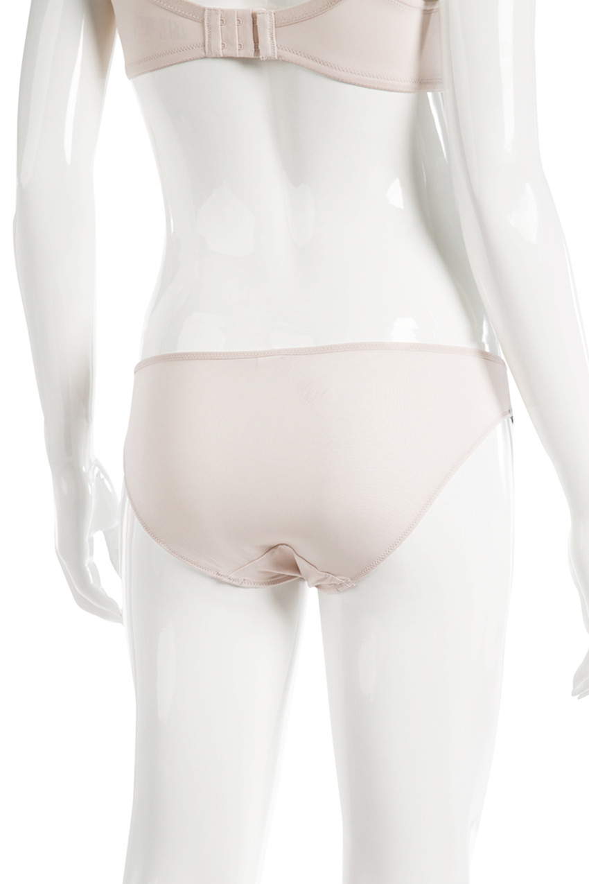 Culotte rose pâle avec empiècements effet dentelle noire sur les côtés. Devant et dos unis. Biais festonnés sur le devant avec petit noeud cousu.