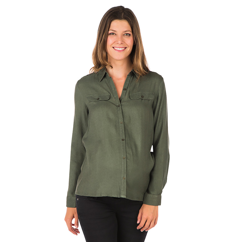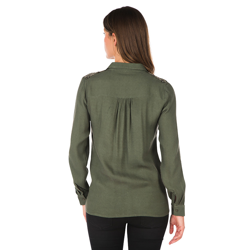 Chemise de grossesse kaki manches longues. Col chemise. Ouverture boutonnée devant. 2 poches à rabat sur la poitrine. Perles et sequins cousu sur les épaules. Fronces dans le dos.