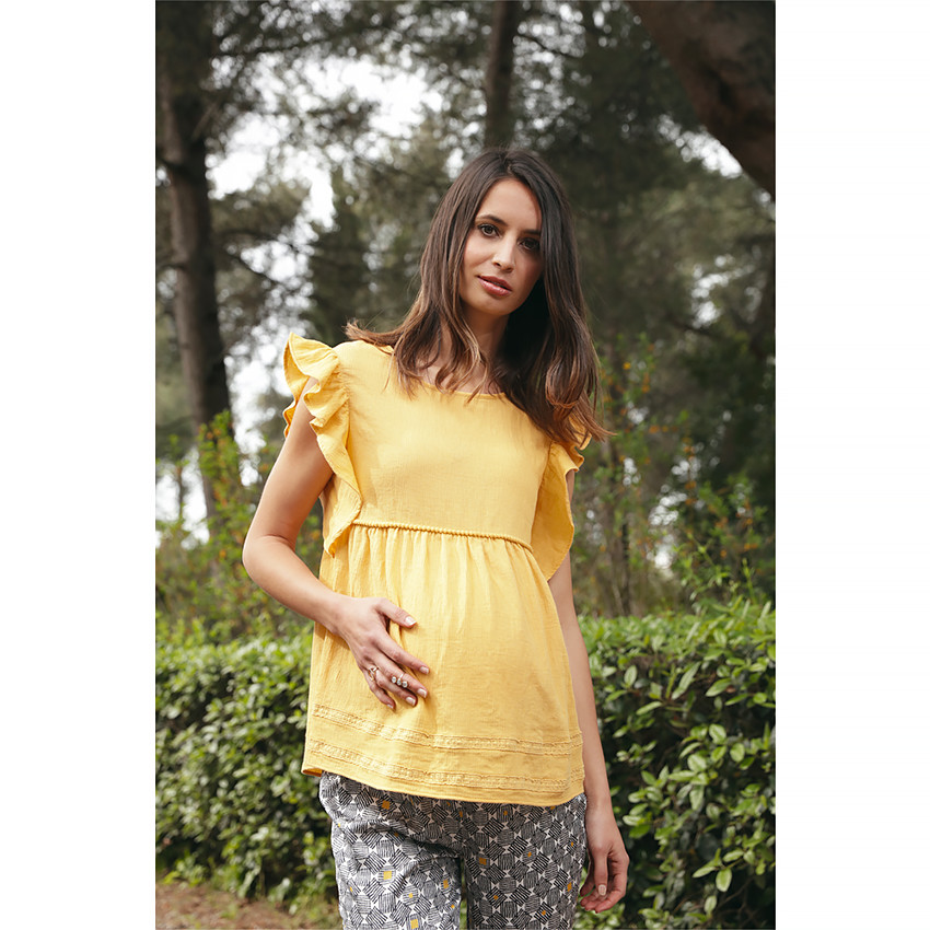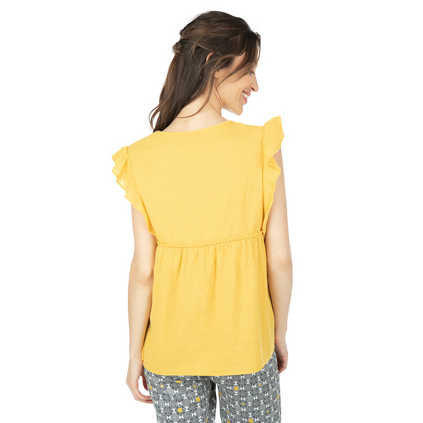 Top de grossesse en crêpe à manches courtes volantées. Encolure ronde. Découpe sous poitrine avec galon à pompons. Maille ajourée sur le bas du top.