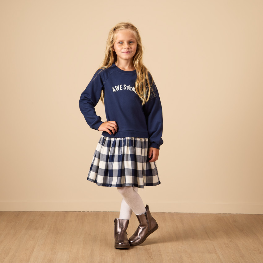 Robe manches longues à carreaux imprimé fleurs pour fille