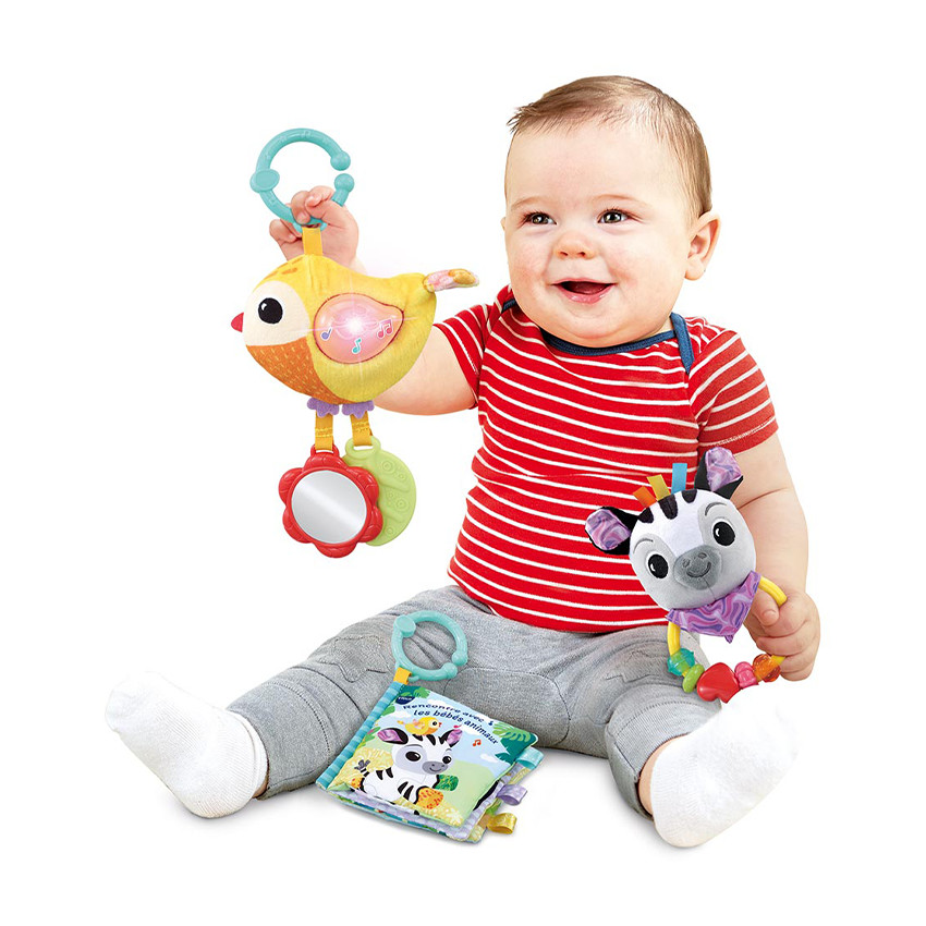 - Et enfin, un oiseau musical pour écouter 6 chansons et 45 mélodies, sons et phrases. En plus de sa fonction musicale, l'oiseau est muni d'un miroir pour que bébé appréhende son reflet, et d'une feuille de dentition qui s'avèrera très utile en période de poussées dentaires. Ce jouet présente lui aussi des couleurs et matières diverses.