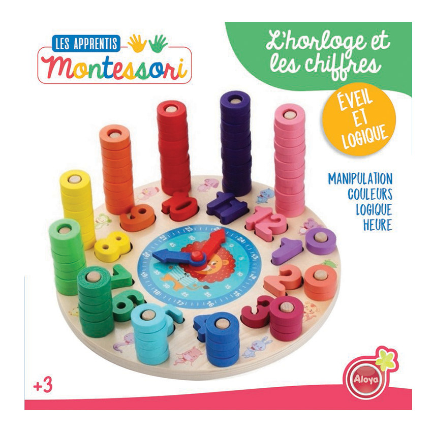 Horloge en bois avec chiffres et formes colorĂ©s en bois. L'apprentissage de l'heure tout en dĂ©veloppant lâhabilitĂ©e la prĂ©cision, ainsi que l'apprentissage et la reconnaissance des formes. MĂ©thode d'apprentissage.