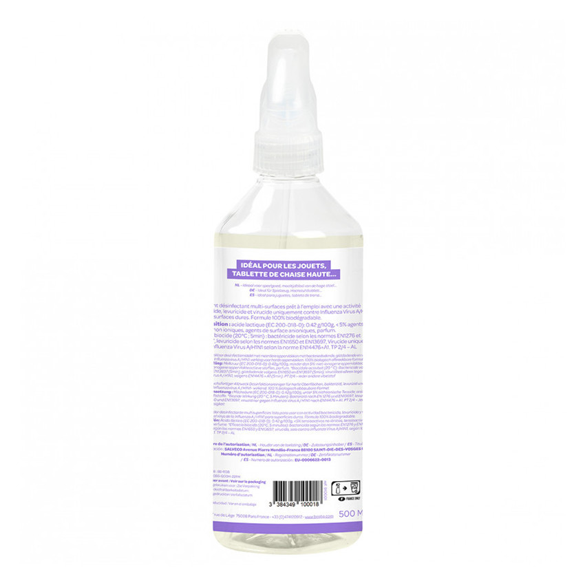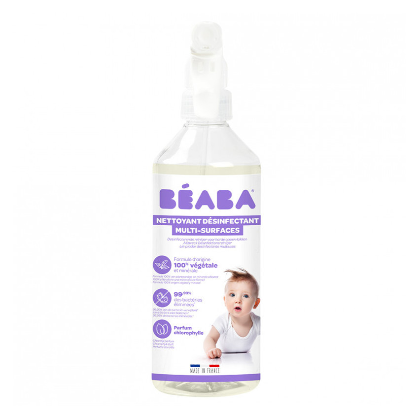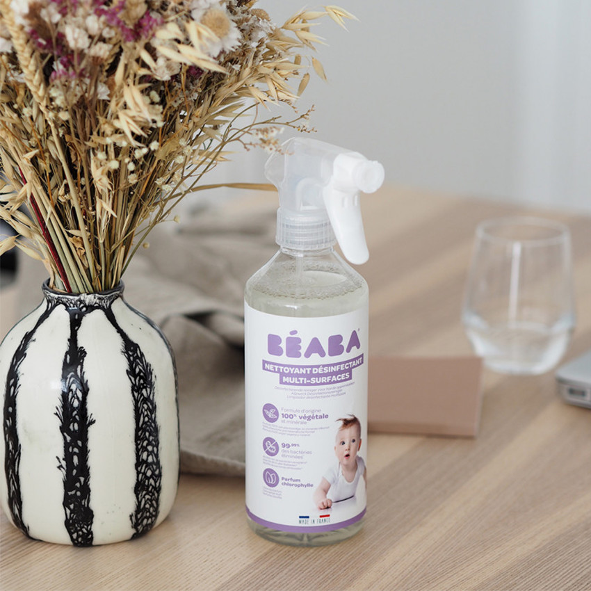 Le liquide désinfectant multi-surfaces de Beaba est livré en flacon de 500 ml avec une « tête-spray », le tout recyclable. Son utilisation est très simple : appliquez le produit en gardant la surface humide 5 minutes, frottez ou brossez si nécessaire, puis rincez à l'eau propre les objets qui peuvent être portés à la bouche de bébé ou en contact direct avec les aliments. Le tour est joué !
